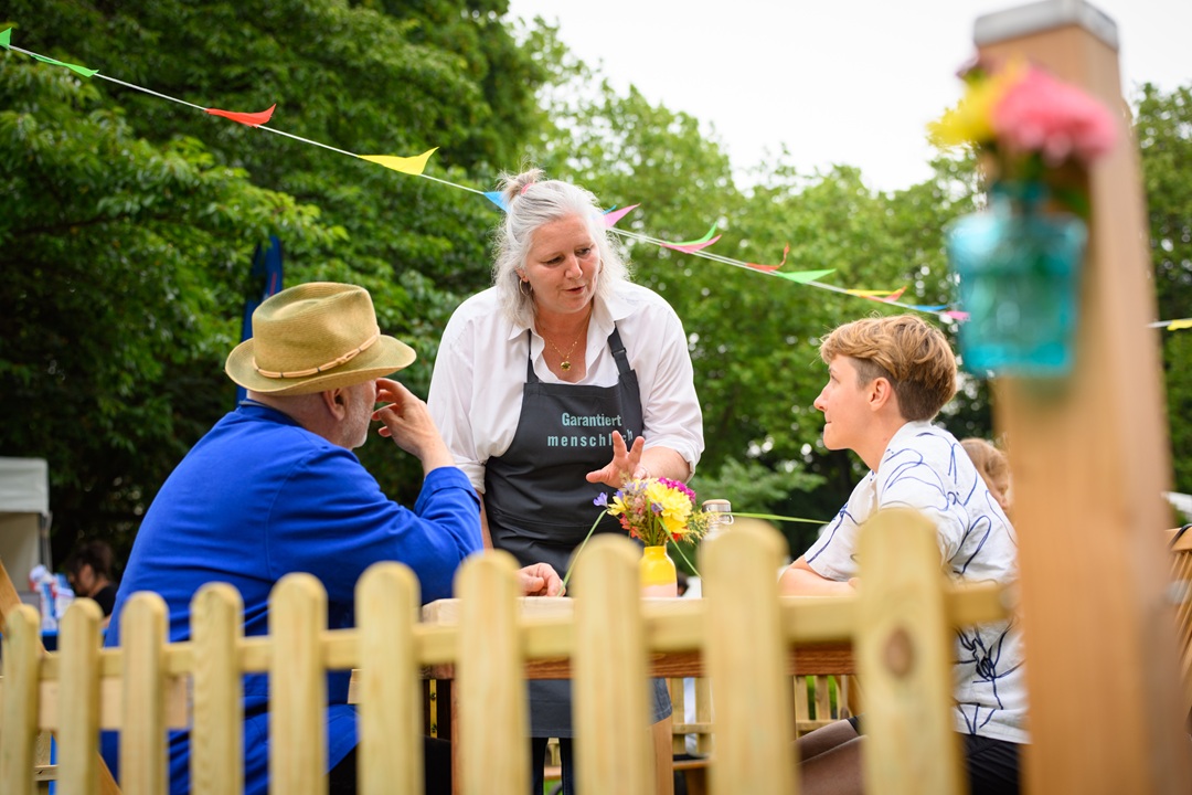 In einer lebendigen Atmosphäre bringen die Performer:innen Passant:innen, Neugierige, und alle die Lust darauf haben miteinander ins Gespräch zu kommen, an den Tisch. Dabei ist alles möglich: Gedanken äußern, einander zuhören, gemeinsam lachen, diskutieren und den Moment genießen. Es entstehen echte Momente des Miteinanders, in denen die Begegnung mit völlig Fremden zu einer bereichernden Erfahrung wird.